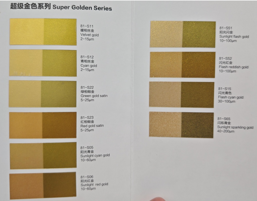 Серия Tuocai Gold Series покрыта диоксидом титана и оксидом железа, нанесенными на поверхность слюды. Благодаря точному контролю соотношения диоксида титана и оксида железа, покрытие позволяет получить золотистый блеск различных оттенков. Серия нетоксична и безвкусна, обладает высокой термостойкостью, кислото- и щелочестойкостью, светостойкостью и непроводимостью. Она решает проблему обесцвечивания традиционного медного порошка в суровых условиях. Золотой цвет этой серии насыщенный,